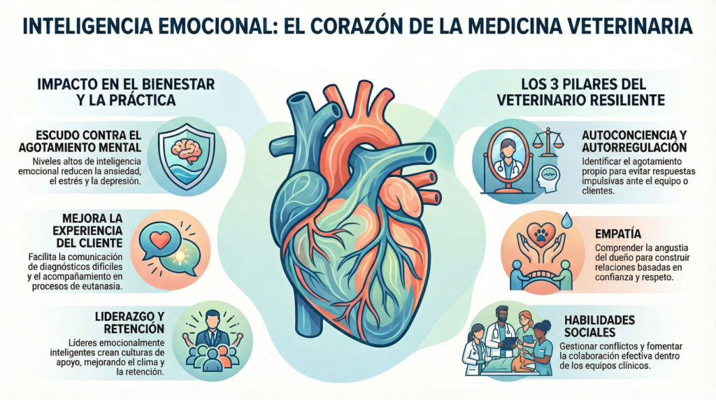 Además, estudios recientes demuestran que una mayor inteligencia emocional está asociada con menores niveles de ansiedad, estrés y depresión entre veterinarios, lo que sugiere que esta habilidad no solo es valiosa para la práctica, sino también para la preservación de la salud mental a largo plazo.